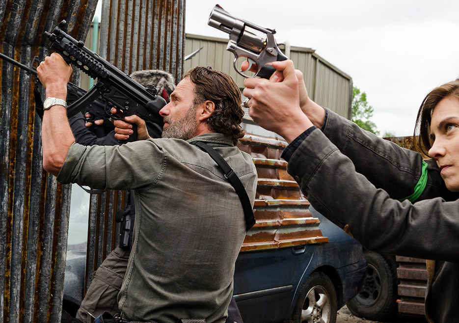 救世主のアジトが手薄になると、リックたちはアジトを取り囲み銃声でニーガンを誘い出す。