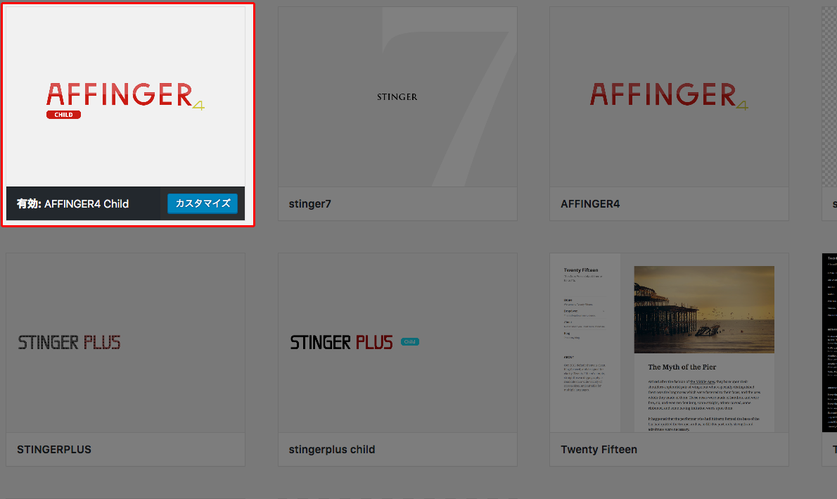 AFFINGER4では子テーマファイルが標準で同梱されていますので、themeフォルダにこれをアップし、WordPressメニューの「外観」→「テーマ」からこの子テーマを有効にしておきます。