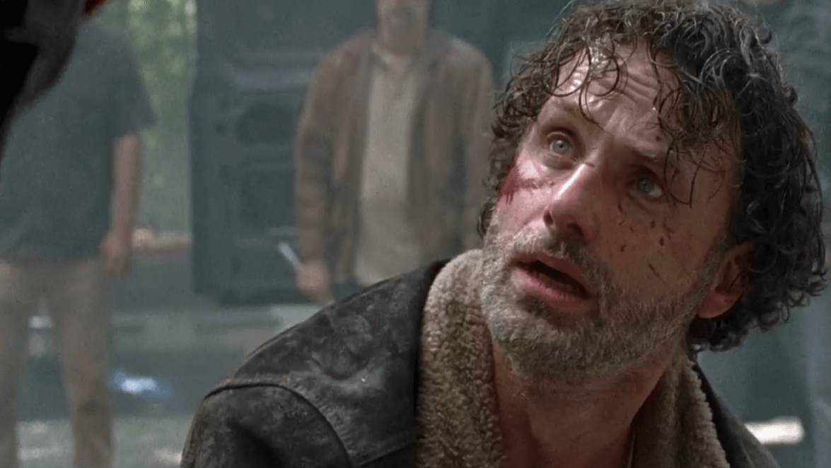 車から引きずり降ろされたリックの前にはエイブラハムとグレンの遺体、そして残りのメンバーたちが跪かされていた。(残りのメンバーは殺されておらず、処刑の回想は離脱したリックが恐れた光景を表していた)
