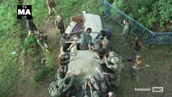 しかし車が故障しており、更に運悪く銃を持ったウォーカーが銃を乱射(引き金を引いたわけではなくトリガーがひっかかっていた)し事態は一変。ふたりは車に乗り込み何を逃れるが、車ごとウォーカーの群れに囲まれてしまう。