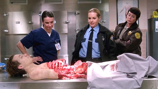 頭を冷やそうと外に出たドナは不審な血痕を発見、ひとりでその痕を追うが、そこで保安官が女性警官を殺している様を目撃してしまう。