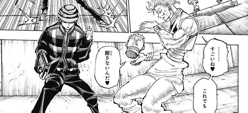 前回、切り落とした人形の首をバンジーガムでぶん回して攻撃し始めたヒソカ。そこからのミーニングでしょうか今回のタイトルは「頭部」。