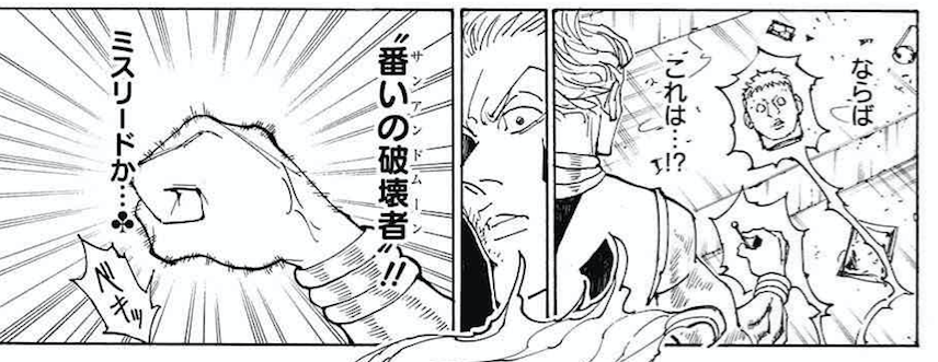ヒソカvsクロロ編はもう少し続きそうですが、謎のひとつであった番いの破壊者(サンアンドムーン)の布石が今回登場します。