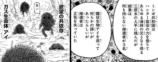 [hxh33]の挿絵で掲載された、暗黒大陸の生物の危険度ランク表によれば、アイの凶暴性はA-2。「その生物の生態や行為が大多数の人間の命を危険にさらす」と表現されています。これはまさに「おねだり」の代償ととれますね。
