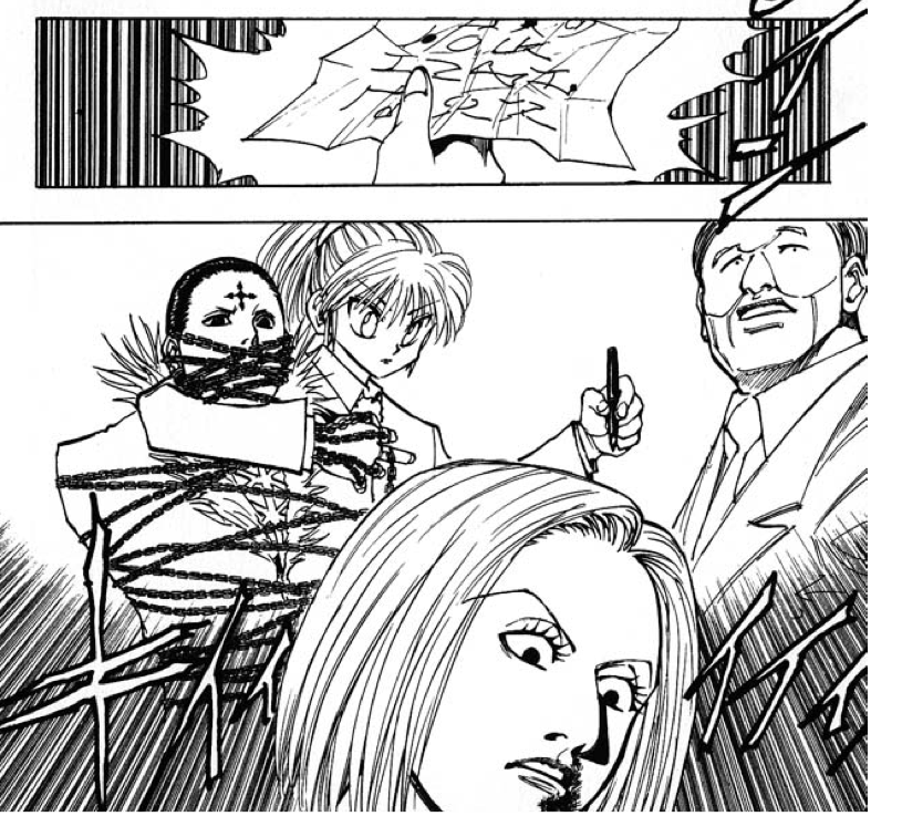 戦闘能力については念能力者かつ旅団員という時点で、最低限のポテンシャルを持ち合わせているはずです。ヨークシン編・ベーチタクルホテルで停電による暗転シーンでゴンとキルアの攻撃をもろに受けていますが、とっさの出来事で「硬」や「堅」でガードできなかったのだとしても歯と腕をおる程度で済んだ、というのはそのポテンシャルの証明にならないでしょうか?