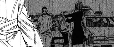 パクの原作初登場回は[hxh8]のNo.071「オークション開催!!」で、旅団がアジトにしていたヨークシンの廃ビルにて団員全員が集まっているシーンです。この時の作画は、キャラ設定が定まっていなかったのか結構ヒドくて、悪意で描いた松雪泰子のようです…。