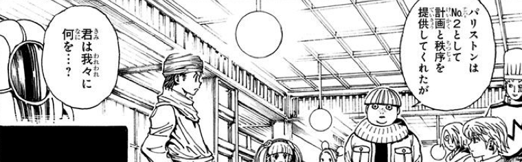 [hxh32]で十二支んを脱退後、カキンに集結したビヨンド・ネテロの渡航チームに参加していたパリストン。[hxh33]ではすでにチームの中でNo.2のポジションに座しています。