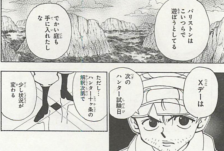 ただ、次のハンター試験=渡航メンバー選抜のことを指しているのでしょうが、この描写からすでにジンはパリスが2択を用意する動きまで察知していたのでしょう。だとしたら「でかい庭」=(元NGL自治区)はどう関与するのか…?