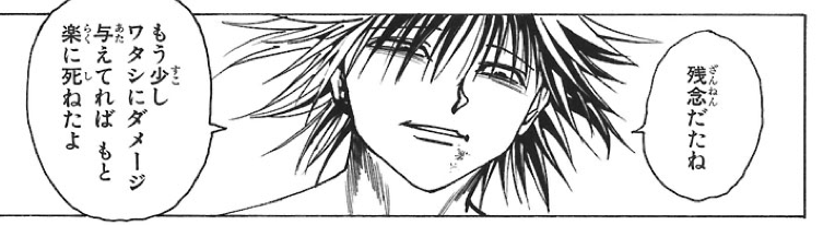 好戦的、相手をいたぶるのが好き、という狂気性はヒソカに通ずるものがありますが、彼のソレとは若干ベクトルが違うでしょうか…。