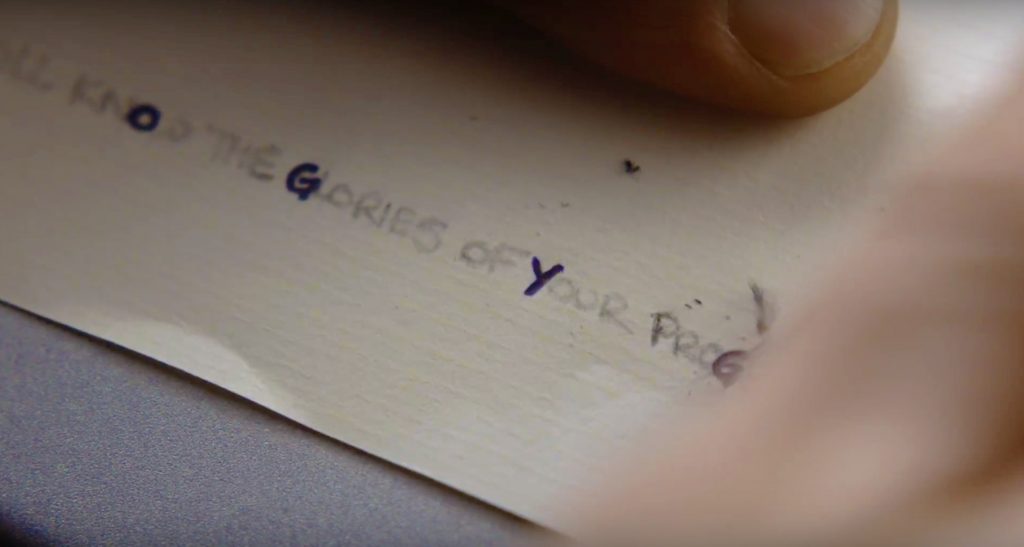 メッセージに沿って消しゴムを欠けると、特定の言葉の文字だけが消えて、新たなメッセージが浮かび上がる。