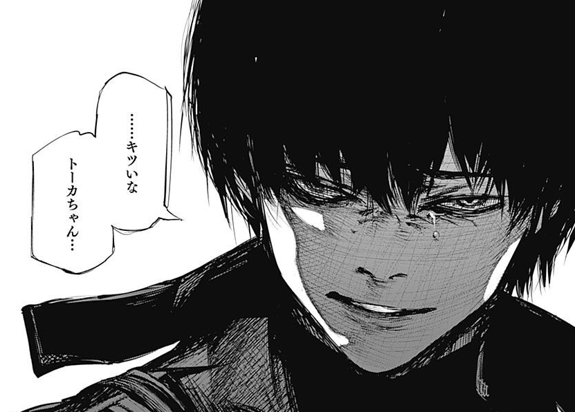 にして、有馬つよすぎる。覚醒カネキでもぜんぜん歯がたたない。新たに登場した クインケ・羽赫/SSS「フクロウ」 はこの戦いで使うのが初めて、とされているけど初めて使う武器でこんなに圧倒的に使いこなせるもんなんすかね。