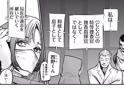 「西野くん」と呼ばれているけど、これ西尾先輩の元カノ「西野貴未」…?なぜ嘉納と行動をともにしているのか?もしかして彼女も喰種に…?