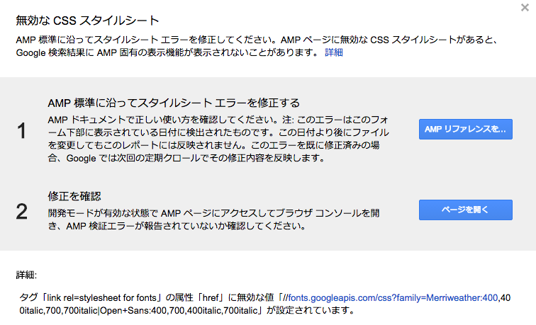 AMPページ内に読み込んだCSSに問題があるのかな?って思ったけど、原因はGoogleフォントだった模様。linkタグでhrefで外部スタイルを読み込んでいるんだけど、どうやらソコがエラーの原因らしい。SSL対策で//から記述したからなのか?