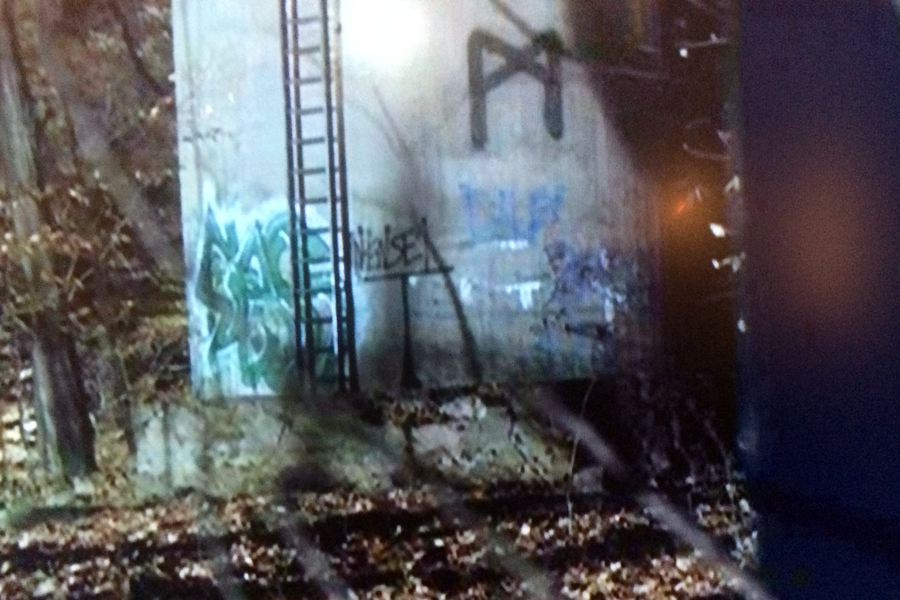 森のなかの給水塔へむかう一行。給水塔には例のマークが。