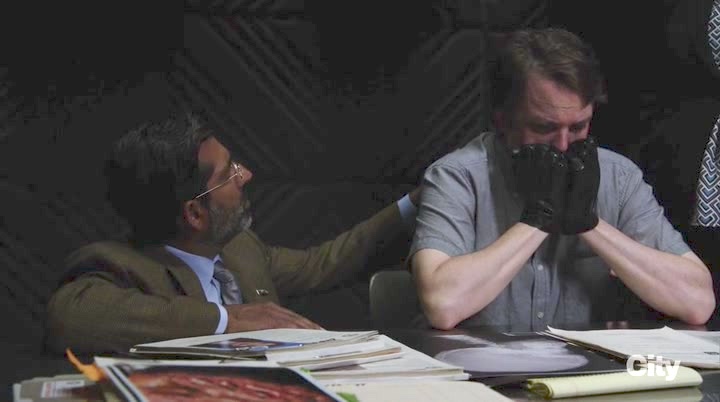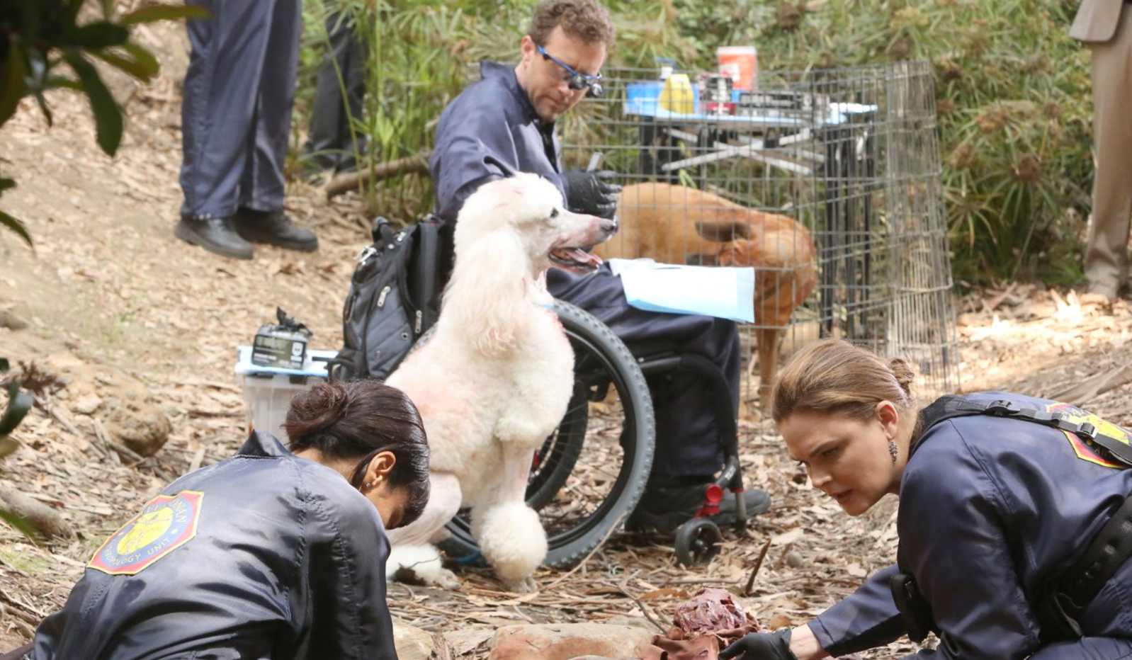 犬たちは遺体を食い荒らしてしまったため、ホッチンズは犬の毛についた組織を採集しようとバリカンを取り出すが、毛をかられるのを拒否する飼い主と揉み合いになり、バリカンを持つ手が滑って自分の眉毛を剃り落としてしまう。