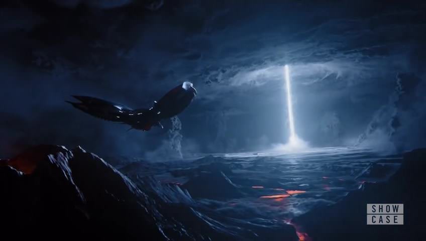 煙が立ち込め溶岩が流れるジェンジェダに降り立つ宇宙船。光の柱が地表から天に登る光景が目に映り、それが「オーバーマインドと繋がっている状態」なのだという。