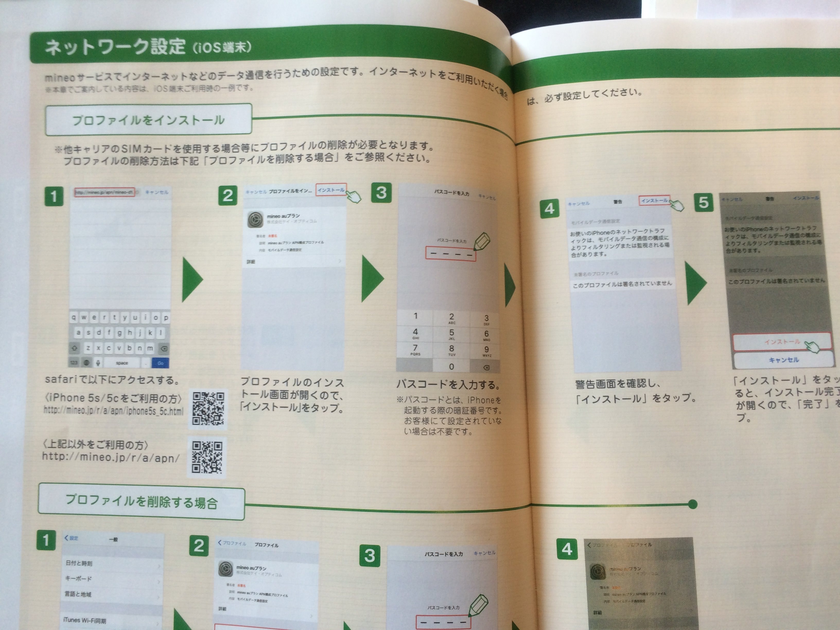 専用のプロファイルをインストールする作業ですので、接続できるWiFi環境のあるところで作業しましょう。「ご利用ガイド」の「ネットワーク設定」を参照し所定のURLへiPhoneでアクセスします。mineo auプランiPhone5s/5c用… (docomoならdocomoプラン)というプロファイルをインストールします。