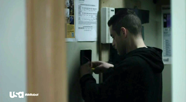 トイレに席を立ち、システムを乗っ取るための装置をとりつけようとする。危うくタイレルにバレそうになるがエリオットは無事に装置を取り付ける。