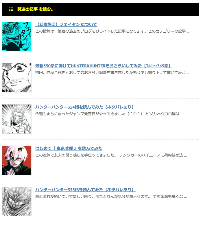 このブログで使っているWordpressテーマ・ STINGER の関連記事 を表示させる機能、記事下に並んでるやつです。