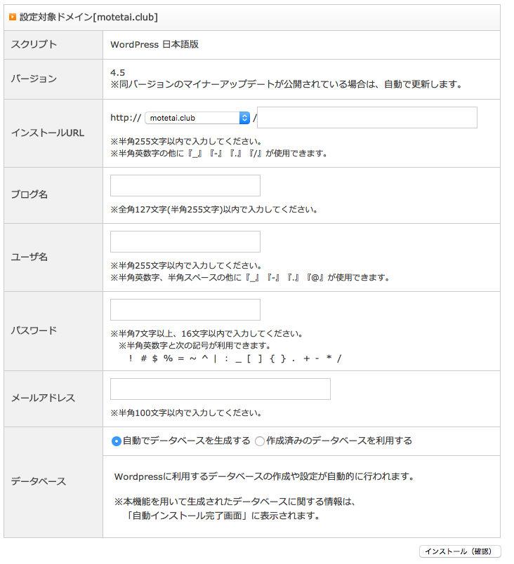 サーバーパネル左メニューの「ホームページ」から「自動インストール」→任意のドメインを選択→「プログラムのインストール」の順で選択。「WordPress 日本語版」の「インストール」をクリックすると下記のような設定画面が出ますのでお好みに合わせて設定しましょう。