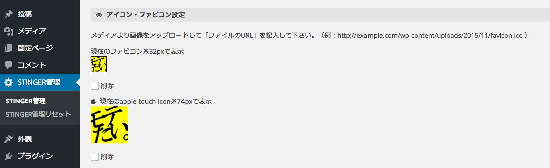 メニューの「STINGER管理」から「アイコン・ファビコン設定」で一度画像を削除し、メディアから新たに参照しなおしましょう。