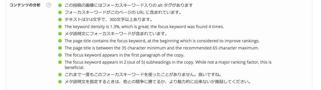 ですが、前項までの修正をしてきた段階で「Yoast SEO」の単語判別回数が増えたようで、この項目は自動的にグリーン判定に変わりました。